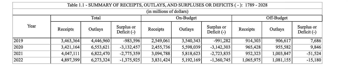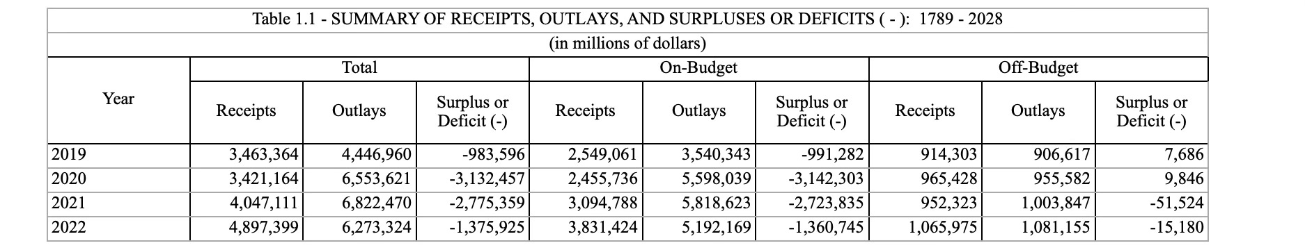 Even worse, although the economy is growing, a significant portion of the growth is government deficit spending, which is an unsustainable model for economic prosperity. According to Macrotrends, the national Gross Domestic Product has risen from $21.4T in 2019 to $25.5T in 2022, a healthy growth of $4.1T in new economic activity. But over approximately the same period (because the Federal Government works on an October fiscal year and GDP data uses the calendar year) US Federal Government outlays increased from $4.4T in 2019 to $6.3T in 2022 - a $1.9T increase according to data downloaded from the OMB at the White House.