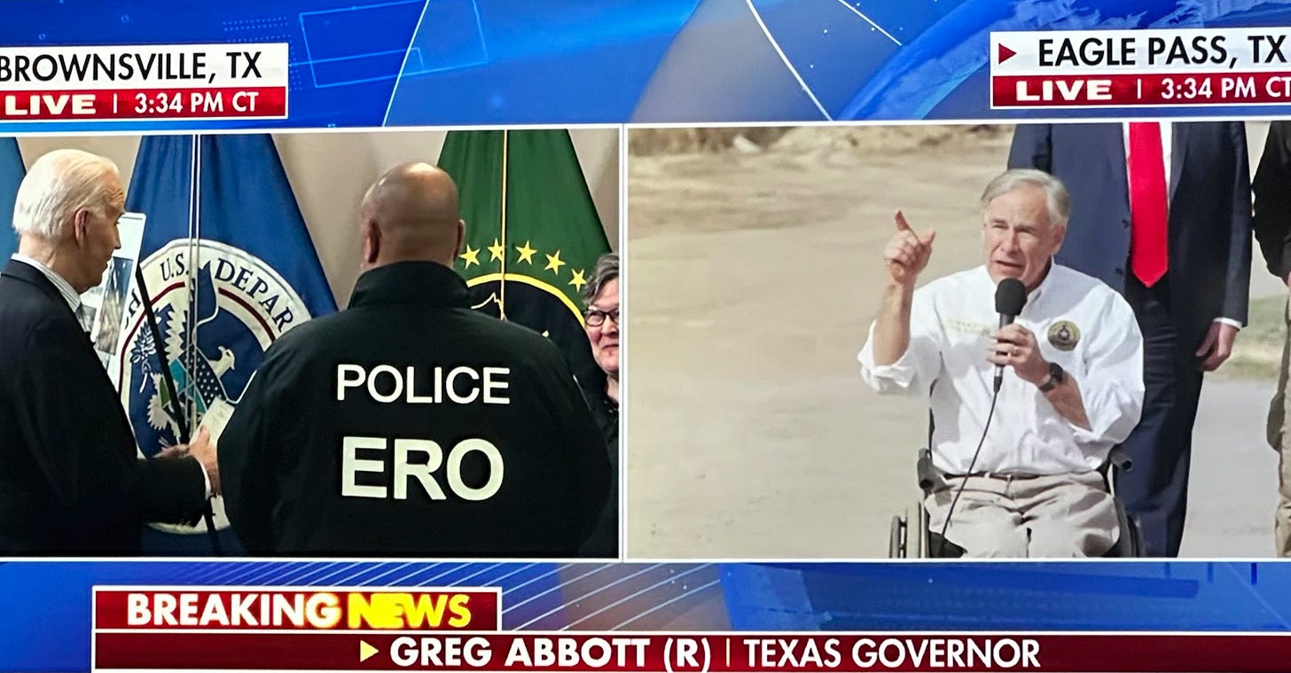 Yesterday, there was a Presidential Cowboy Showdown in Texas, as both former President Trump and President Biden visiting the border state to discuss the state of our border. When the cameras turned on at about 4pm eastern time yesterday afternoon, President Trump spoke first from Eagle Pass, TX, joined by Governor Abbott of Texas. Mr. Trump gave an extemporaneous speech from notes, speaking at length about the border crisis and what he would do to solve the problem. As we’ve pointed out, the former President detailed how the current President unwound his border strategy through various Executive Orders, causing the current crisis. Mr. Trump then handed the microphone over to Governor Abbott, who did a ten minute takedown of President Biden’s border policy that was something to see. As you see in the screen shot above, the Governor was out on the border while President Biden was inside somewhere discussing flags. Here’s just some of what the governor had to say: